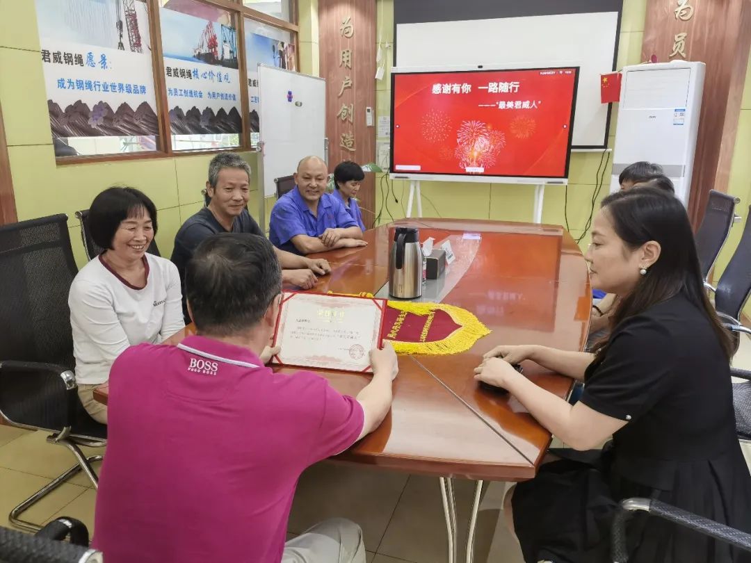 盡管現(xiàn)在朱阿姨要光榮退休了,公司卻始終對(duì)其保持著一份敬意和關(guān)懷。董事長(zhǎng)親自為朱志芳頒發(fā)了"最美君威人"榮譽(yù)證書,以及帶有充分感激和祝福的錦旗。頒發(fā)過程中,董事長(zhǎng)說:"感謝多年來你對(duì)君威的貢獻(xiàn),在崗位上一直任勞任怨,此次的離開希望你日后的生活中,好好調(diào)理身體,開心的過好每一天!"言語中充分對(duì)朱志芳的貢獻(xiàn)給予了肯定。